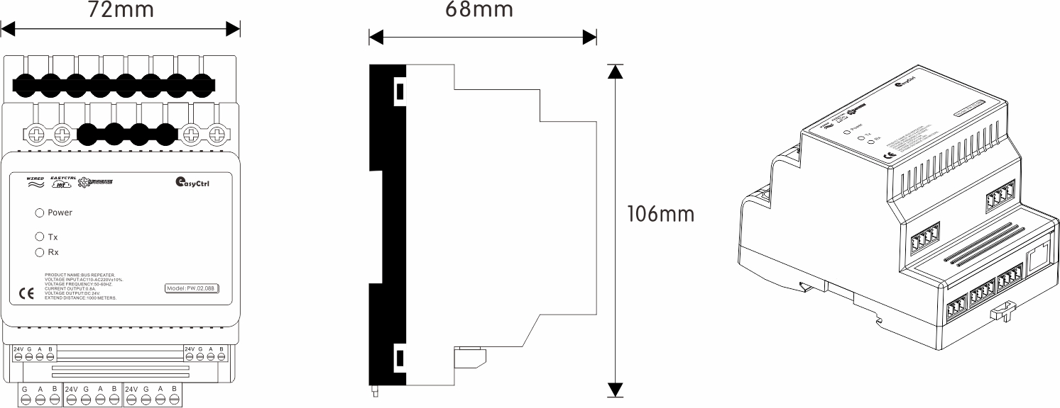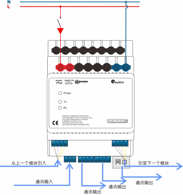 PRODUCT FUNCTION 功能作用系統電源供電單元,提供24V/800mA電源可供給6個設備供電,用于電箱與電箱的信號級聯模塊,總線大于300米需加配此模塊,帶4口總擴展功能;