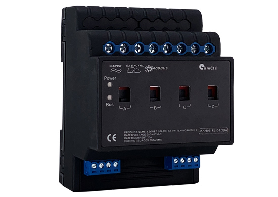 系統開關執行單元,一般安裝在配電箱內,導軌式安裝,占4個模數位,提供4路20A繼電器開關,采用磁保持繼電器,自帶機械強切開關功能,在系統死機或斷電的時候,也可開關繼電器,每回路可獨立控制4400W燈具的開關總,可控制燈光的開關,設備直流或交流電的通斷,無源干節點的通斷,強電或弱電窗簾的開合,支持YC-BUS總線/RS485控制;