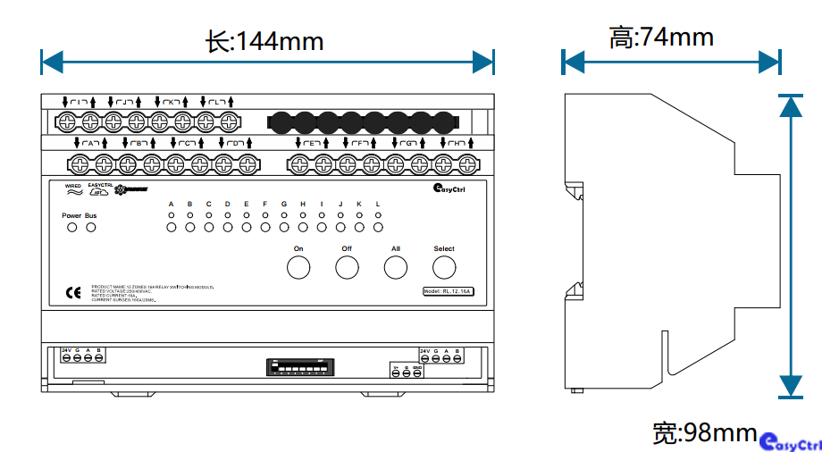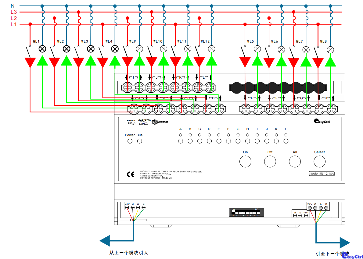 系統開關執行單元,一般安裝在配電箱內,導軌式安裝,占8個模數位,提供12路16A繼電器開關,每回路可獨立控制3520W燈具的開關,可控制燈光的開關,設備直流或交流電的通斷,無源干節點的通斷,強電或弱電窗簾的開合,水機空調的冷熱閥門,高/中/低風速的切換等,支持YC-BUS總線/RS485控制;
