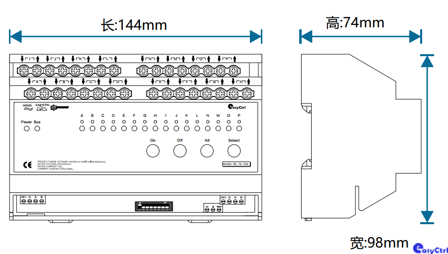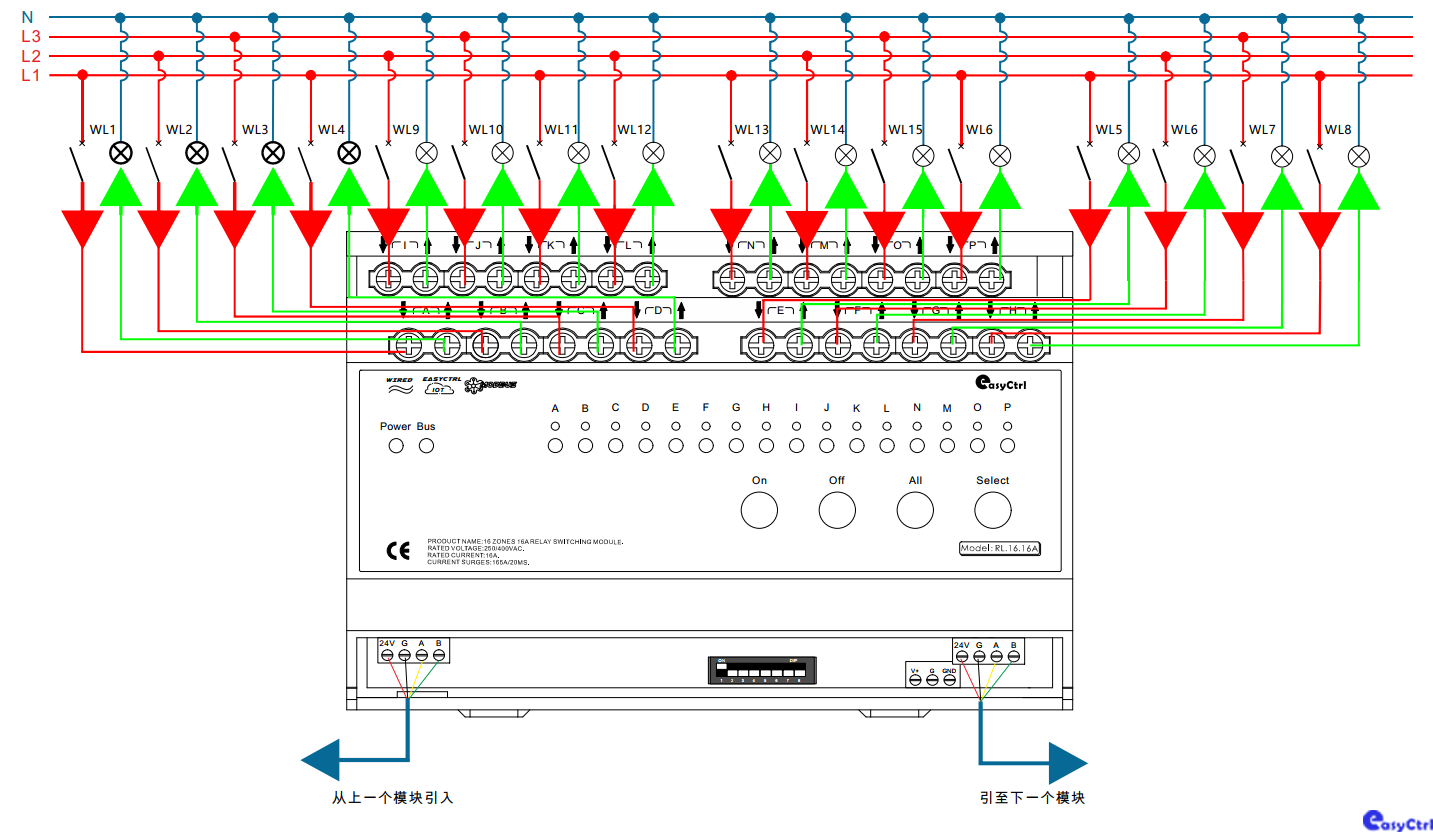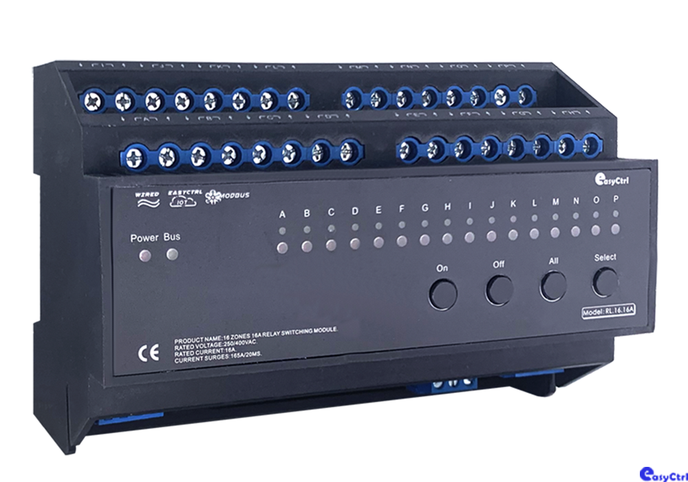 系統開關執行單元,一般安裝在配電箱內,導軌式安裝,占8個模數位,提供16路16A繼電器開關,每回路可獨立控制3520W燈具的開關,可控制燈光的開關,設備直流或交流電的通斷,無源干節點的通斷,強電或弱電窗簾的開合,水機空調的冷熱閥門,高/中/低風速的切換等,支持YC-BUS總線/RS485控制;