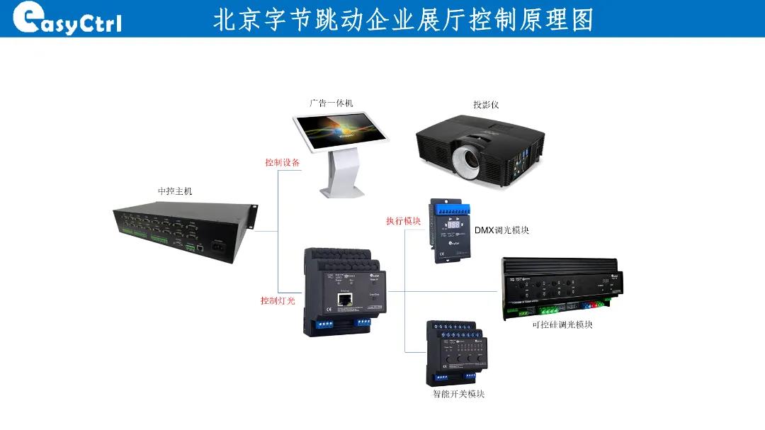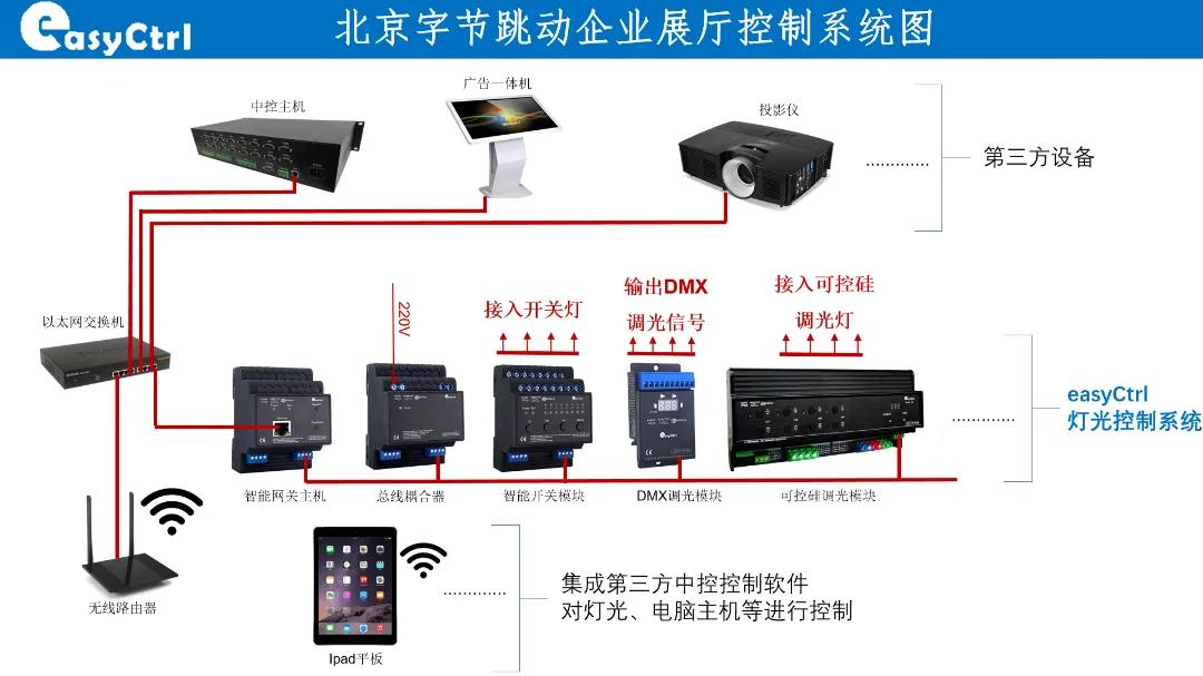3、針對燈光控制解決方案:可通過第三方中控調(diào)用easyCtrl網(wǎng)關(guān)主機控制燈光邏輯指令進行多設(shè)備場景聯(lián)動使用,利用DMX調(diào)光模塊和可控硅調(diào)光模塊對燈光進行調(diào)光、調(diào)色控制、呼吸燈效果.