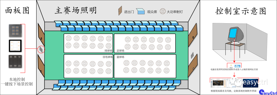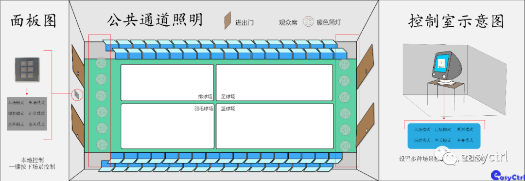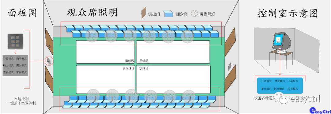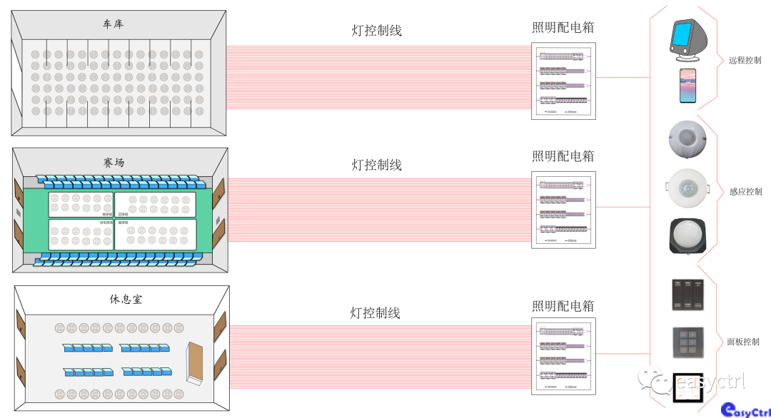 ●布線分析,體育館大致劃分為主賽場、觀眾席、公共通道、休息室、停車場,在傳統的體育館照明回路是從斷路器接到開關再到燈具上的,而斷路器在每個區域裝配電箱內控制。