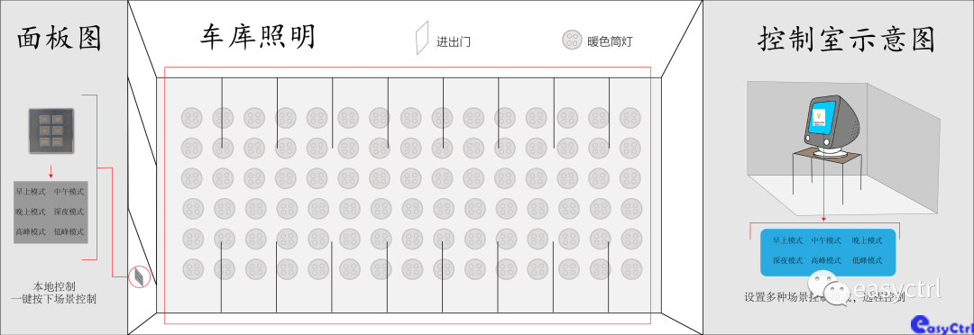 夜間正式比賽活動時,車輛進出繁忙,車庫照明處于全開狀態;白天,采用光照度感應器檢測室外的照明亮度, easyctrl智能控制系統就可根據室外光線的強弱調整室內光線,從而避免了能源的浪費;不比賽時只開啟部分車道燈,當有車進入時就開始所需的照明燈;車停好后或人、車離開后燈延時關閉。當有車移動時可以通過主機顯示出來,方便保安和管理人員管理。