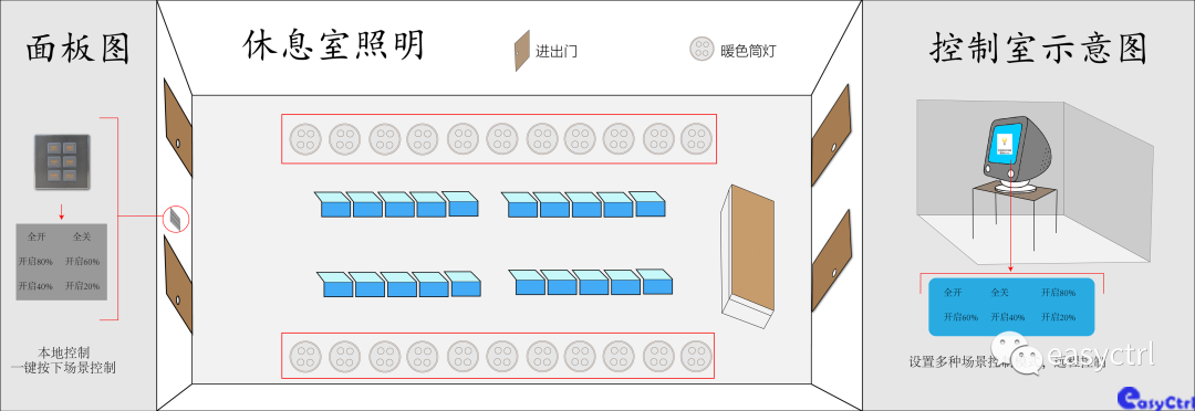 在控制室進出大門安裝按鍵面板,控制室內安裝照明系統控制軟件,集中到電腦進行遠程控制。通過網絡信號進行遠程控制,方便且容易管理;通過按鍵面板控制,操作簡單,在網絡信號不好的情況下,也可進行控制,做到有備無患。
