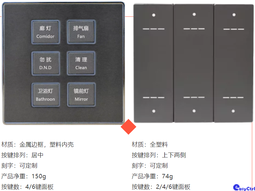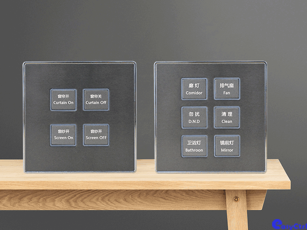 此款半金屬面板采用金屬面蓋塑殼內框,即能提高暴露在外面的面蓋的耐磨防腐度,又具良好的質感,舒適的按鍵感。每個按鍵的名稱可定制,根據場景不同,雕刻不一樣的按鍵名。在室內裝修的環境。