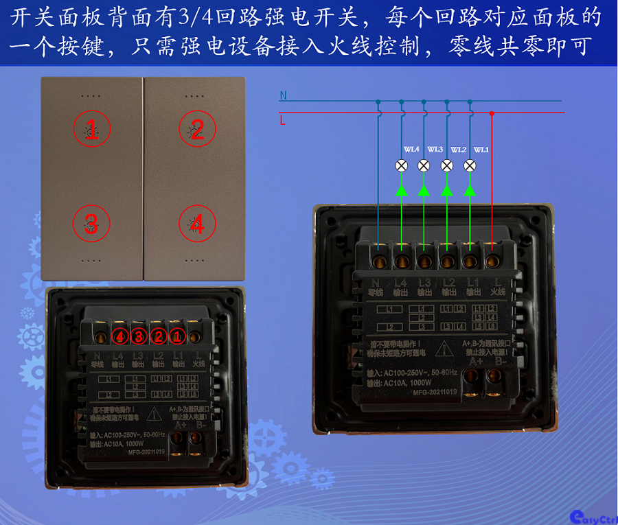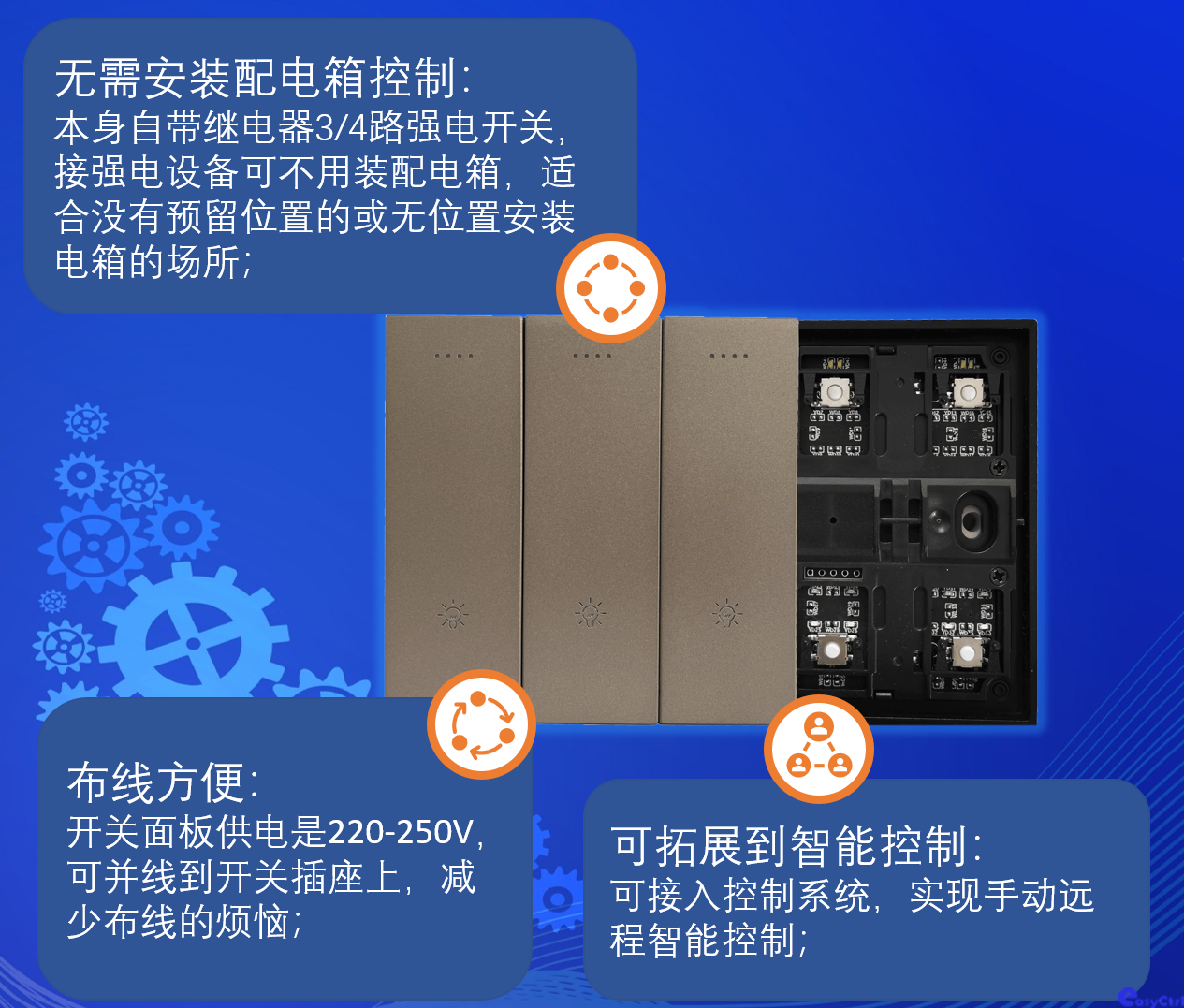 | 雙控功能 | 點擊 3次后 | 第4次長按5秒后進入雙控設置, 狀態燈或光圈燈一直閃爍或慢閃。 一直快閃表示雙控 ID 為 0; 慢閃次數表示雙控 ID 號。 雙控 ID=0: 取消雙控. 一條線路開關模塊最多可設置20個ID(后續可拓展20以上) | 1. 顯示雙控 ID 1.1 選擇雙控 ID *每次點按本鍵選擇雙控 ID 往上加(ID 范圍:0~20); *長按其他鍵 5 秒雙控 ID 回到默認”0”。 1.2 長按本鍵 5 秒確定并保存雙控 ID. *當雙控 ID 不為 0 時, 進入雙控配對;(變為快閃) *當雙控 ID 為 0 時, 直接退出。 1.3 點按其他鍵退出。 2. 雙控配對 2.1 雙控配對: 在 1 分鐘內長按其他面板任意鍵 5 秒, 直到 該鍵狀態燈或光圈燈閃爍一下, 表明雙控配對成功。三控等多控, 同樣的方法去逐個去長按其他 面板的任意鍵 2.2 連續點按本鍵 3 次后, 再長按 5 秒取消雙控, 并退出。 2.3 點按其他任意鍵退出或者連續點按本鍵 6 次 退出 | |